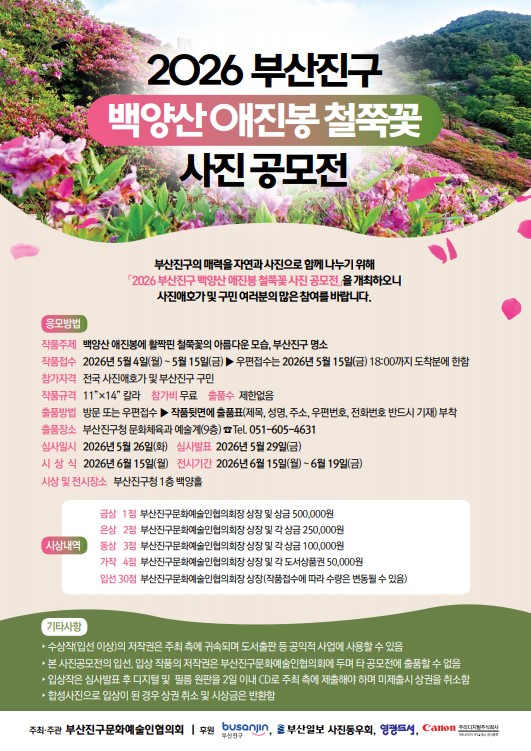 2026 「부산진구 백양산 애진봉 철쭉꽃 사진」 및 「우리동네 이야기 글·그림」 공모전 개최 안내입니다