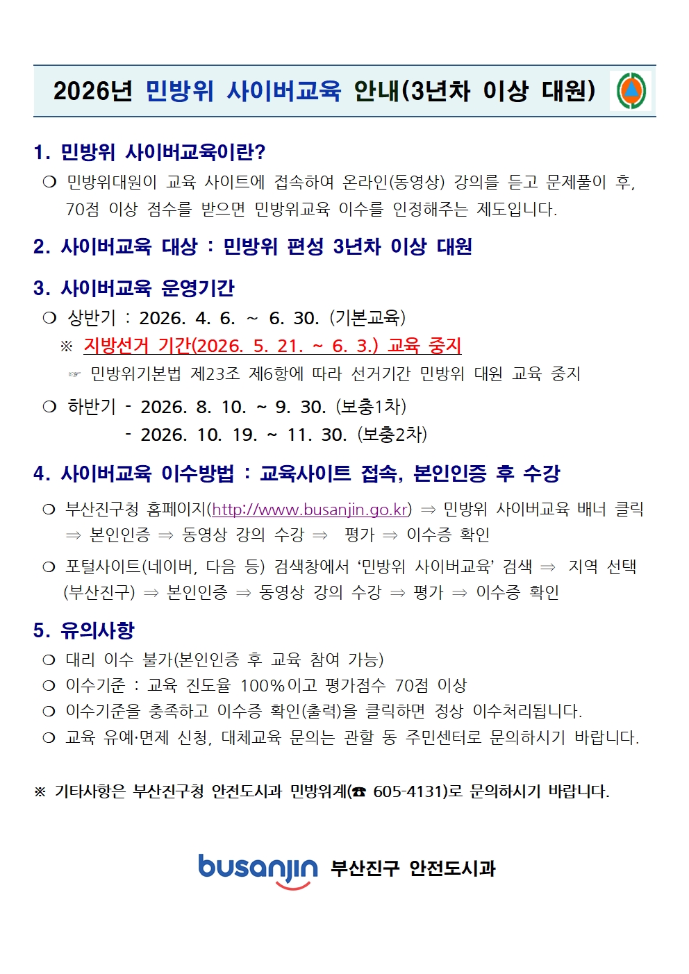 2026년 민방위 사이버교육 일정 참고하시어 반드시 당해 교육 이수해주시기 바랍니다. 감사합니다.