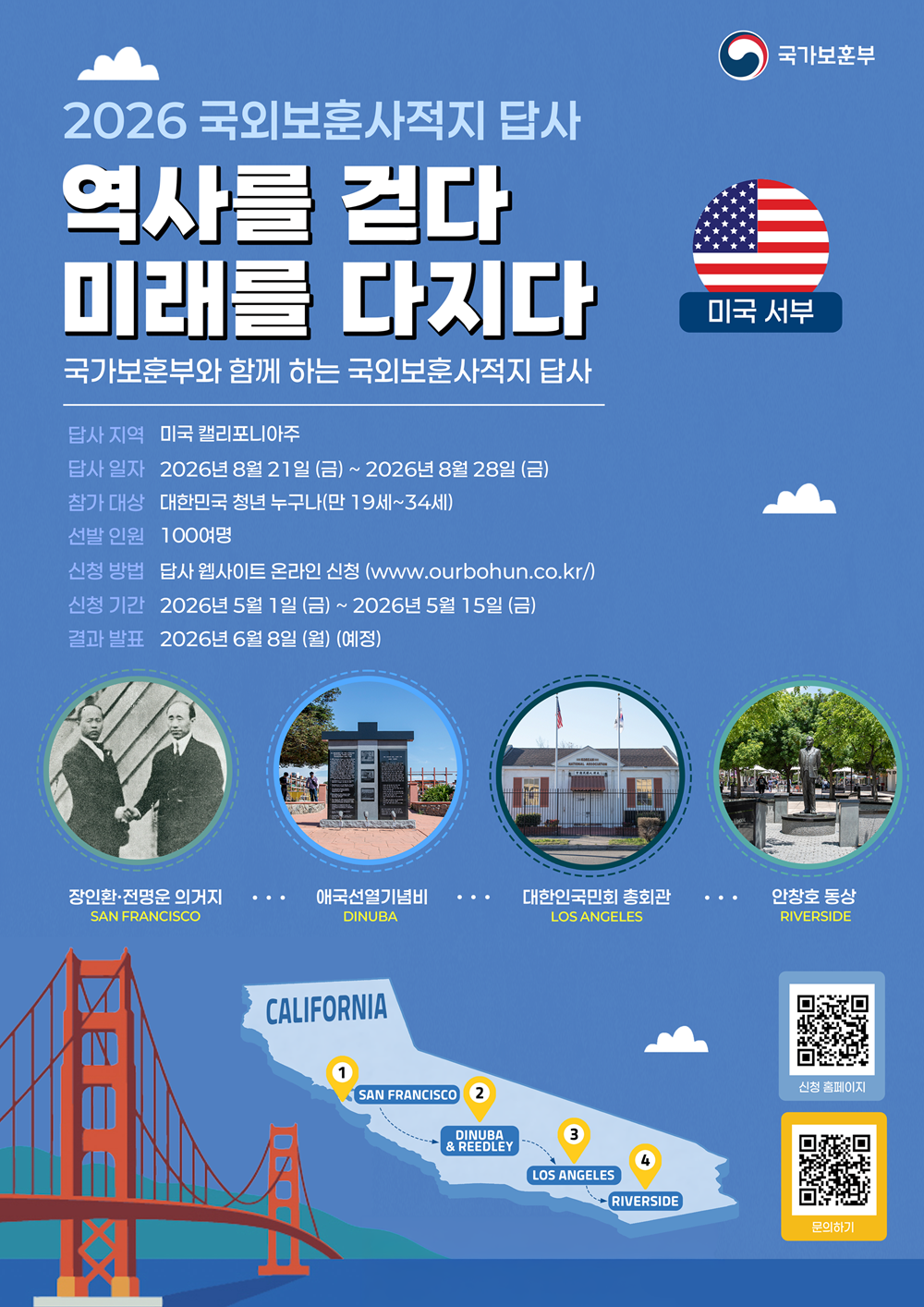 ○ 선발 대상 : 대한민국 청년 누구나(만19세~34세) 100명-해외여행 결격사유가 없으며 출발일 기준 유효기간 6개월 이상 남은 여권 소지자-접수 시작일(2026. 5. 1.) 기준 : 1991년 5월 2일생부터 2007년 5월 1일생까지 *제대군인의 경우, 청년 연령 상한을 복무 기간만큼 연장 적용(최대 36개월