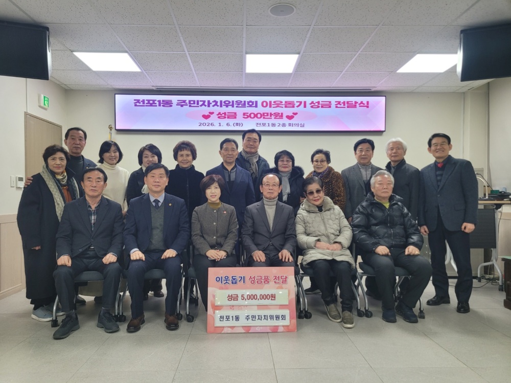 전포1동 주민자치위원회(위원장 윤동호)는 1월 6일 희망 2026 나눔 캠페인'을 맞이하여 전포1동 주민센터(동장 정정란)에 이웃돕기 성금 500만 원을 전달했다.