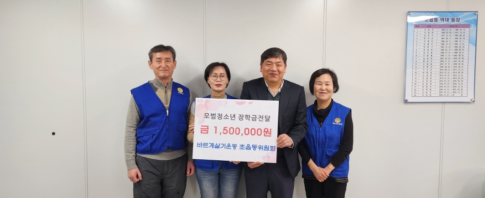 부산진구 바르게살기운동 초읍동위원회(위원장 김미경)는 1월 13일 초읍동 주민센터(동장 정간호)를 통해 형편이 어려운 중·고생을 위한 장학금 150만 원을 전달했다.