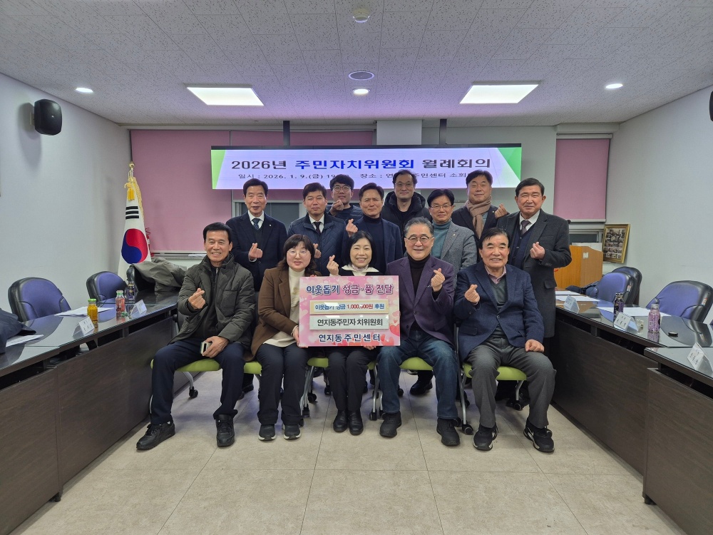 연지동 주민자치위원회(위원장 김선미)는 1월 9일 연지동 주민센터(동장 박미옥)에 어려운 이웃을 위해 써달라는 당부와 함께 희망 2026 나눔캠페인' 성금 100만 원을 기탁 했다.
