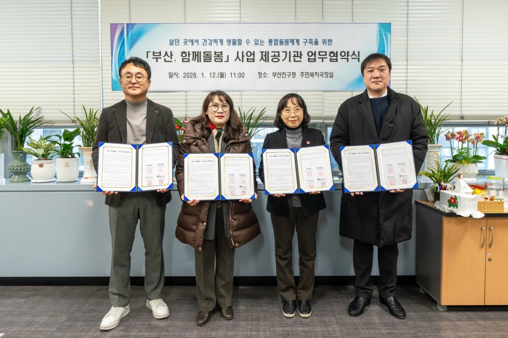 부산진구는 1월 12일 △부산진시니어클럽 △부산진지역자활센터 △한국치매돌봄협동조합과 부산, 함께돌봄' 사업의 상호협력체계 구축을 위한 업무협약을 체결했다.부산진구형 부산, 함께돌봄 사업'으로는 식사영양관리사업, 병원안심동행사업, 퇴원환자 안심돌봄사업 등을 추진하고 있다.이번 협약은 2026년 3월 돌봄통합지원법' 시행을 앞두고 서비스 제공기관과 협력 기반을 강화하고 돌봄서비스가 유기적으로 연계되는 부산진구형 통합돌봄체계를 구축하기 위해 마련됐다.부산진구청장은 "이번 협약을 통해 부산진구형 돌봄서비스를 유기적으로 연계함으로써 지역 내 촘촘한 돌봄 안전망을 구축하는 기반이 되길 바란다"라며 "지속적인 협력을 통해 살던 곳에서 계속 건강하게 생활할 수 있는 통합돌봄 체계를 구축해 나가겠다"라고 말했다. 문의: 복지정책과 돌봄주거계(605-4339)