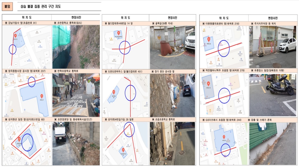 초읍동(동장 정간호)은 쾌적하고 깨끗한 초읍동 조성을 위해 상습 불결 집중 구간에 대한 지도를 제작하였다. 초읍동은 지난 1월 12일부터 30일까지 통학로와 이면도로, 공사가 중단된 현장 주변 등 9곳의 상습 불결 관리 구간을 지도로 제작했다. 해당 자료는 향후 자체 환경정비 활동에 활용할 계획이다. 정간호 동장은 "이번 지도 제작으로 상습 불결 관리 구간 정비의 연속성을 확보, 청(정)백(세)리의 초읍동 만드는 데 힘쓰겠다"라고 밝혔다. 문의:초읍동(605-6585)